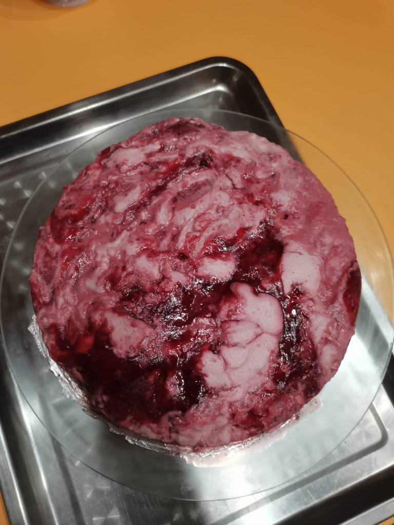 It’s a 3 layers entrement cake. The first layer is a chocolate sponge cake, the second one a berry mousse, and the third one a white chocolate mousse.