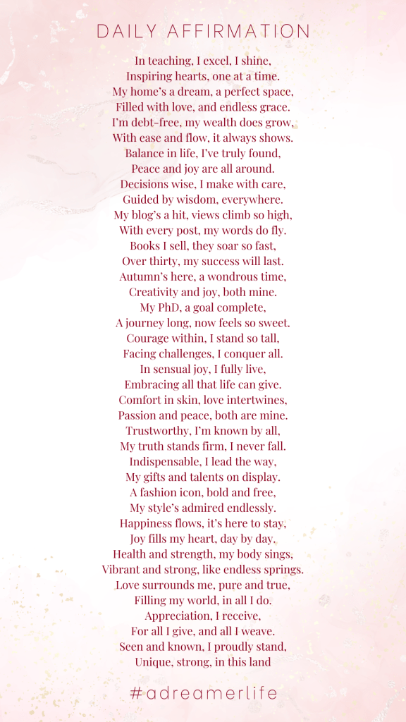 As I made a goal of being more mindful, thankful, and more into spiritual and manifestations, in other words going back to basics, I decided to create a list of affirmations written in present tense to help me in my journey!